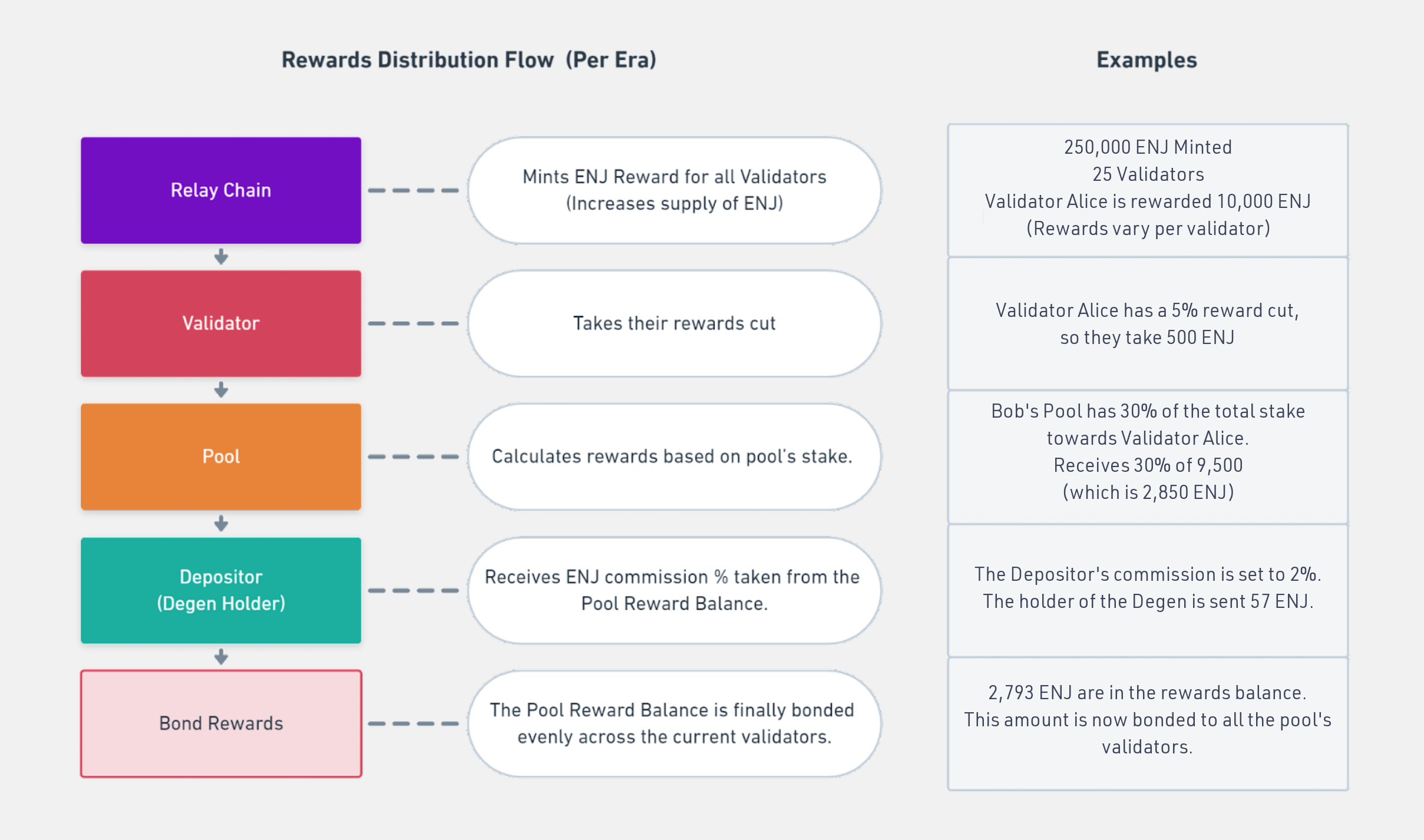 - Validator - Provides security for the network and receives rewards for doing so. On Enjin, these rewards are distributed to nomination pools. (A list of active validators can be seen on Subscan.)